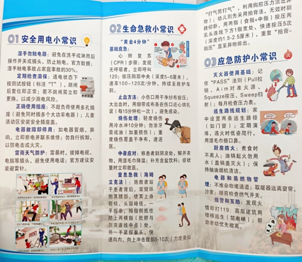 应急防护:普及灭火器“提拔握压”操作步骤及逃生路线规划;针对性提示厨房防火、油锅起火处置及报警互助流程。