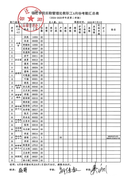 现将后勤管理处(后勤服务公司)、基建处全体教职工2025年6月份考勤结果公示如下,公示时间:2025年7月9日-12日: