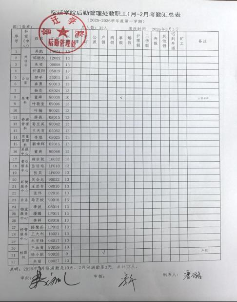 现将后勤管理处(后勤服务公司)、基建处全体教职工2026年1月-2月考勤结果公示如下,公示时间:2026年3月5日-9日: