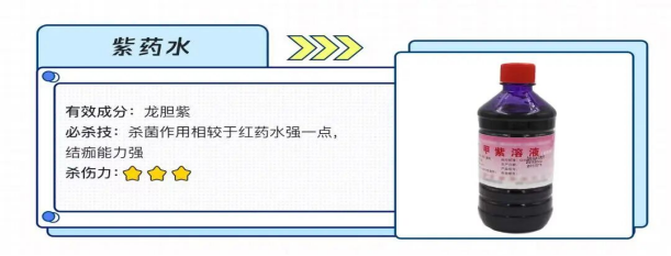 是一种比较老的皮肤、黏膜消毒防腐剂。常用的浓度为1%~2%水溶液,一般外用。紫药水对某些革兰氏阳性菌,特别是葡萄球菌有杀菌作用,对念珠菌也有一定效果。紫药水可用于局部未破损的皮肤表面,不推荐用于黏膜或开放性伤口,并应注意避免与眼睛及破损的皮肤接触。目前紫药水已趋于淘汰。